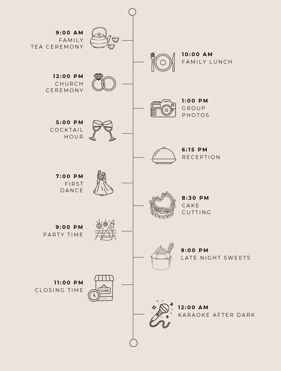 We're thrilled to share the details of our special day with you! Below, you'll find a breakdown of the wedding timeline, including the ceremony, cocktail hour, reception, and all the festivities in between. Take a look to plan your day and get ready to celebrate with us!